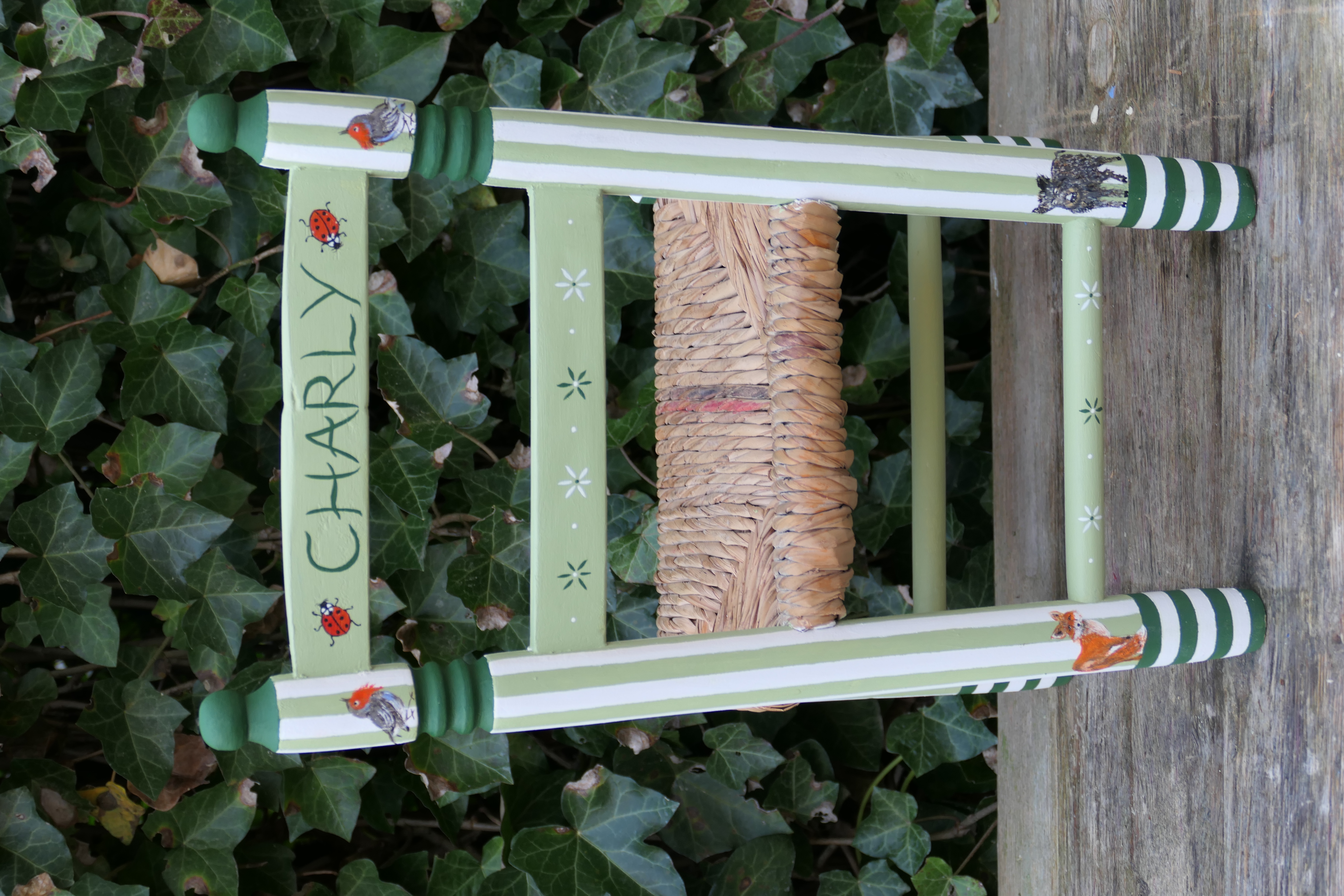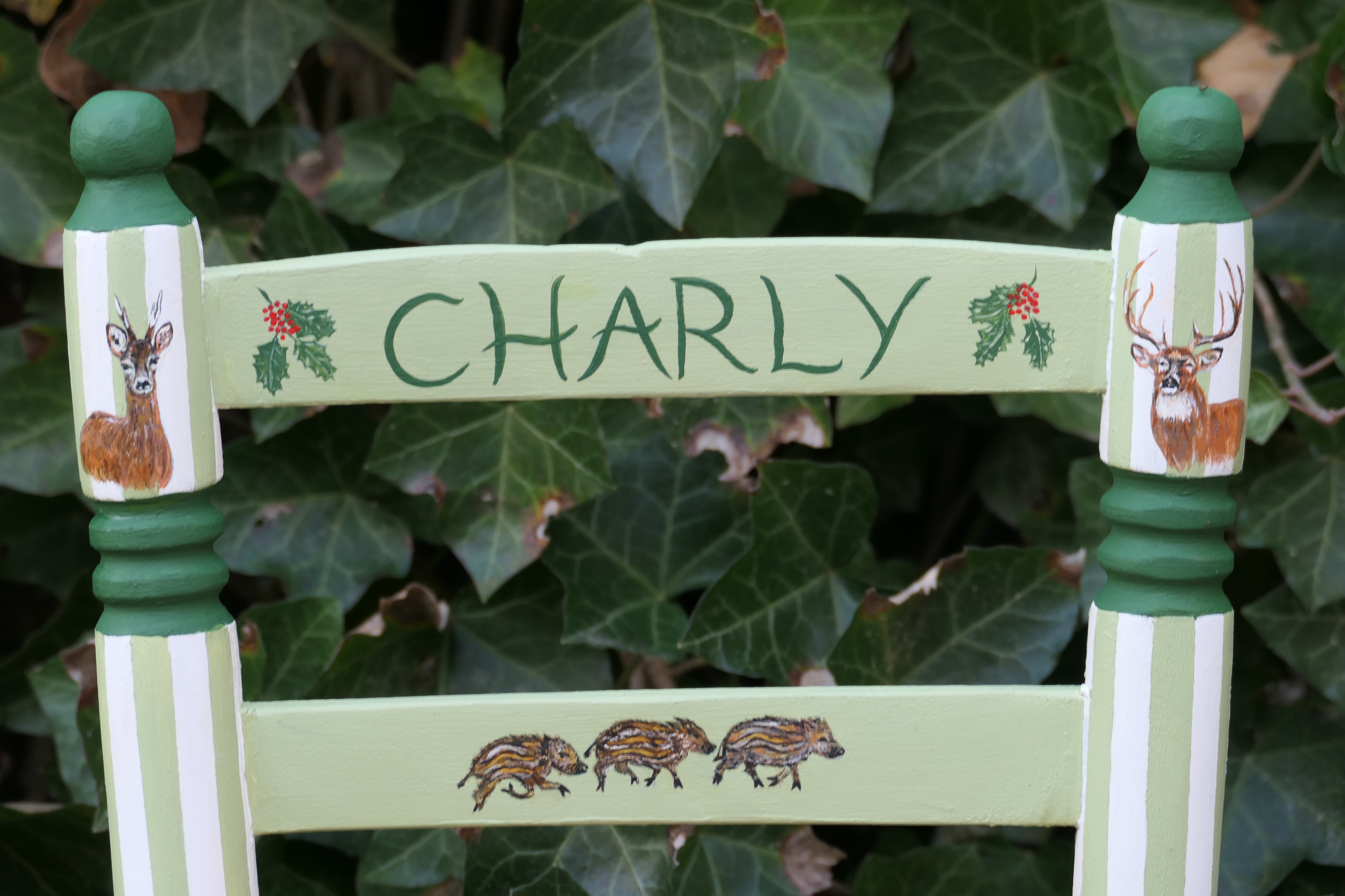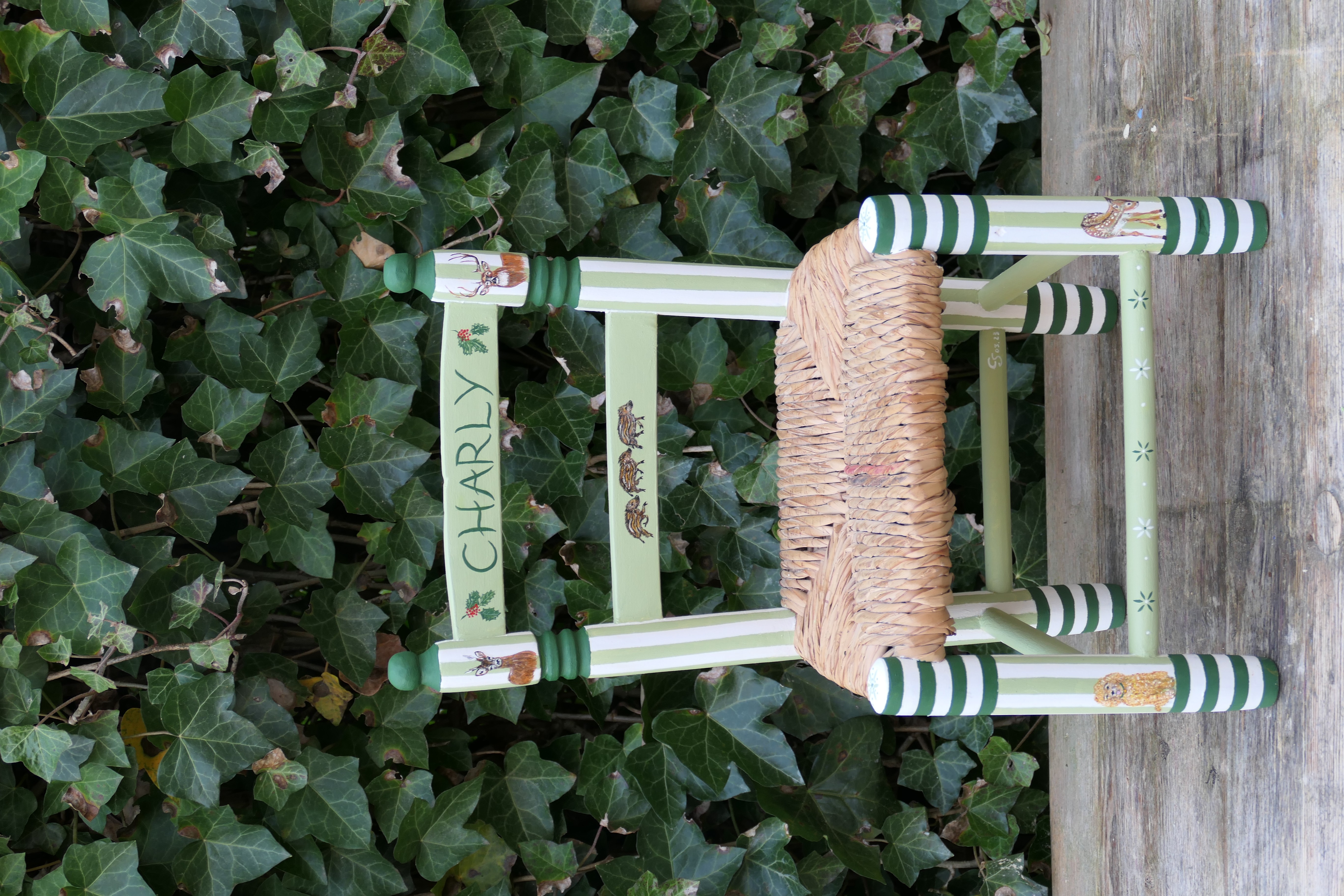Petite chaise ancienne dénichée d’occasion et personnalisée sur mesure pour le petit Charly, arrivé dans une famille passionnée de nature et de chasse, déjà accompagnée d’un adorable poodle.
