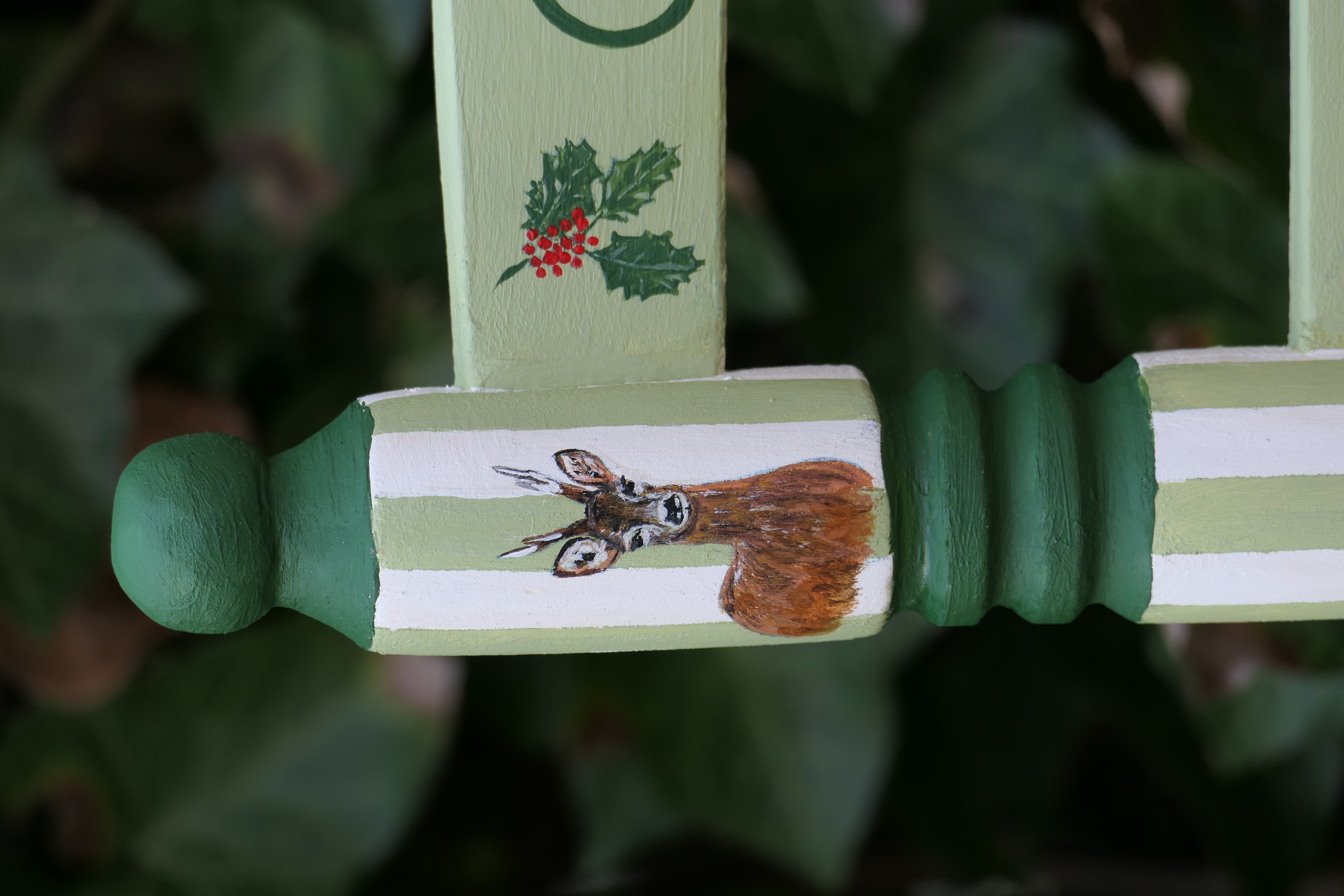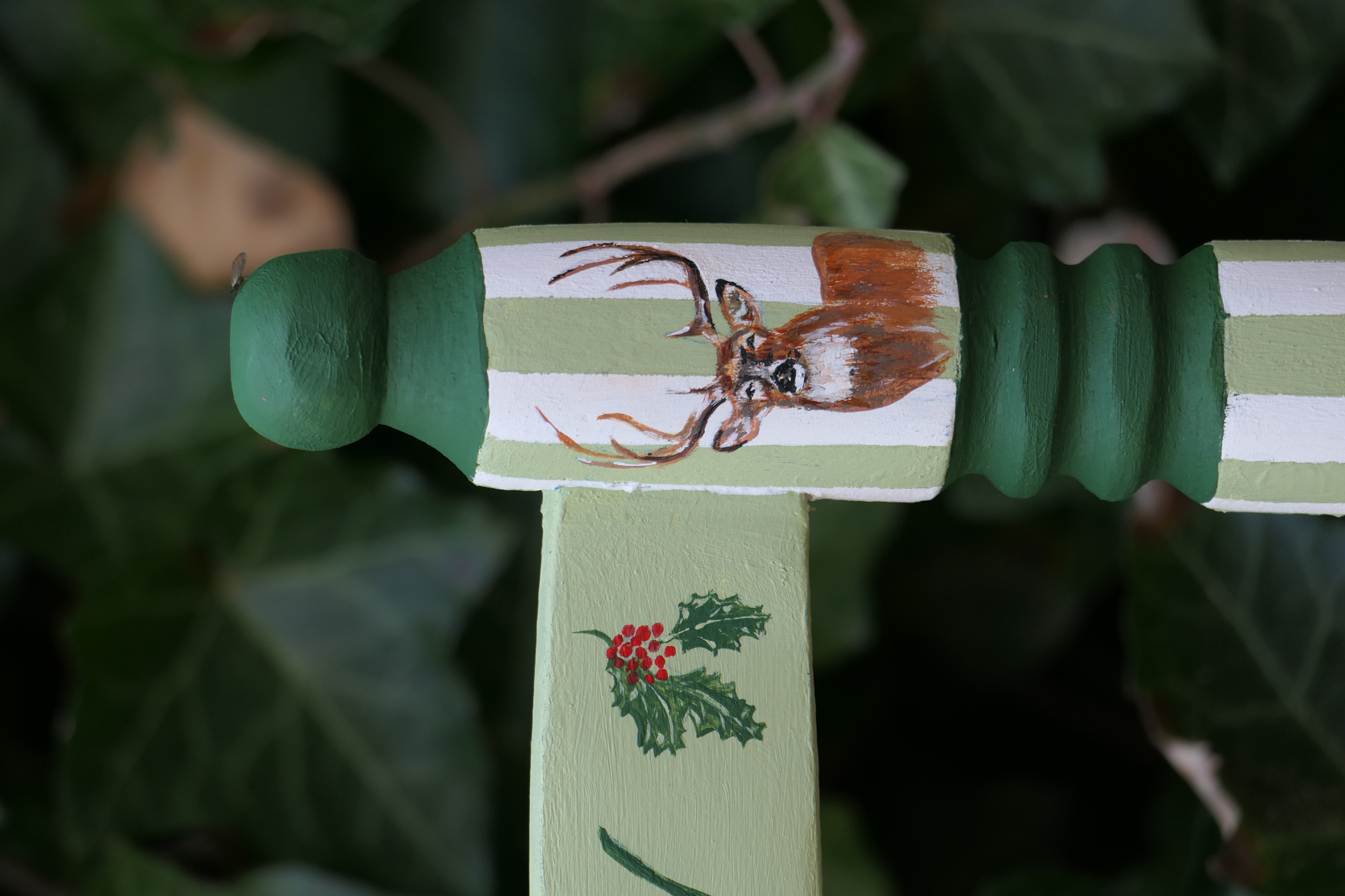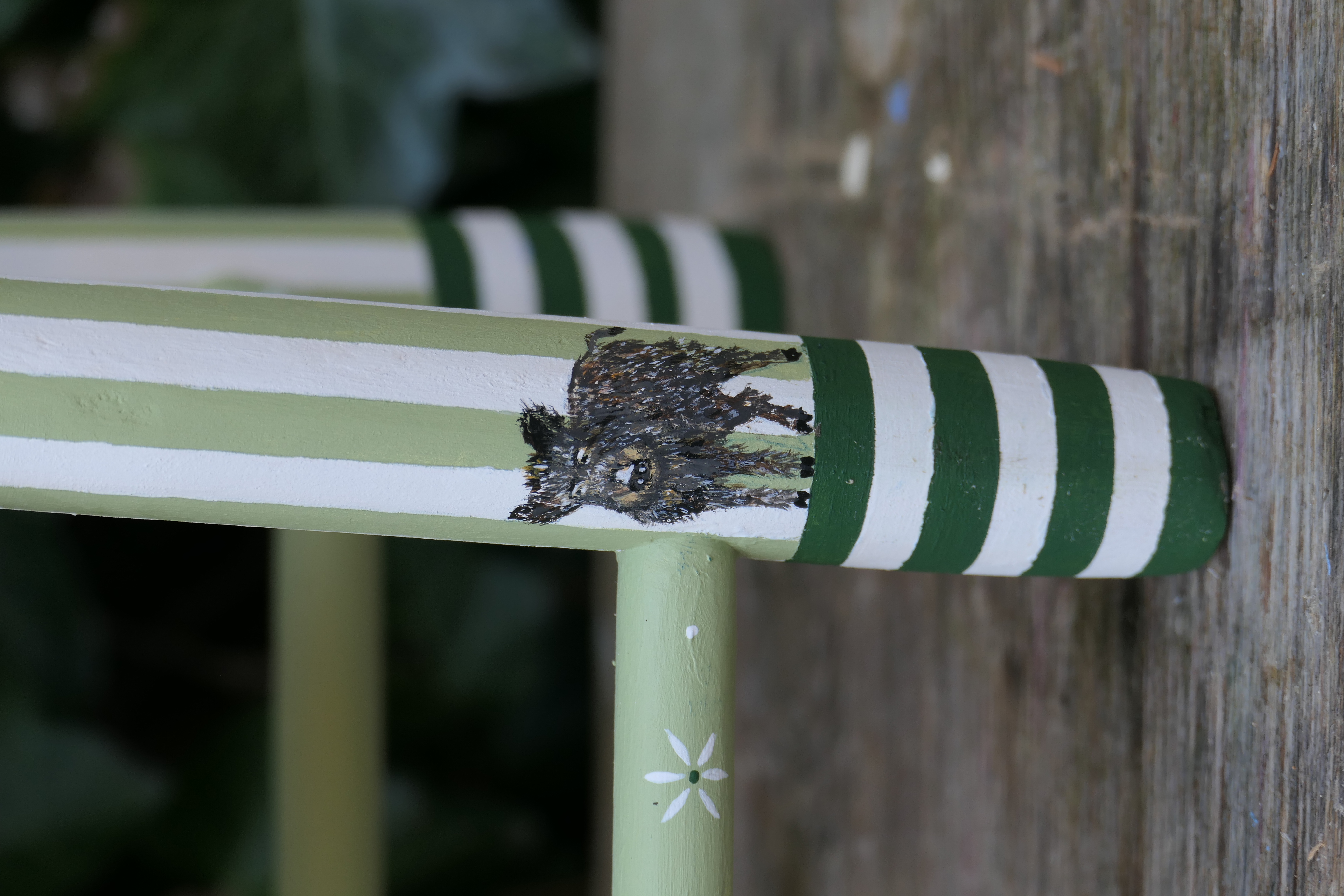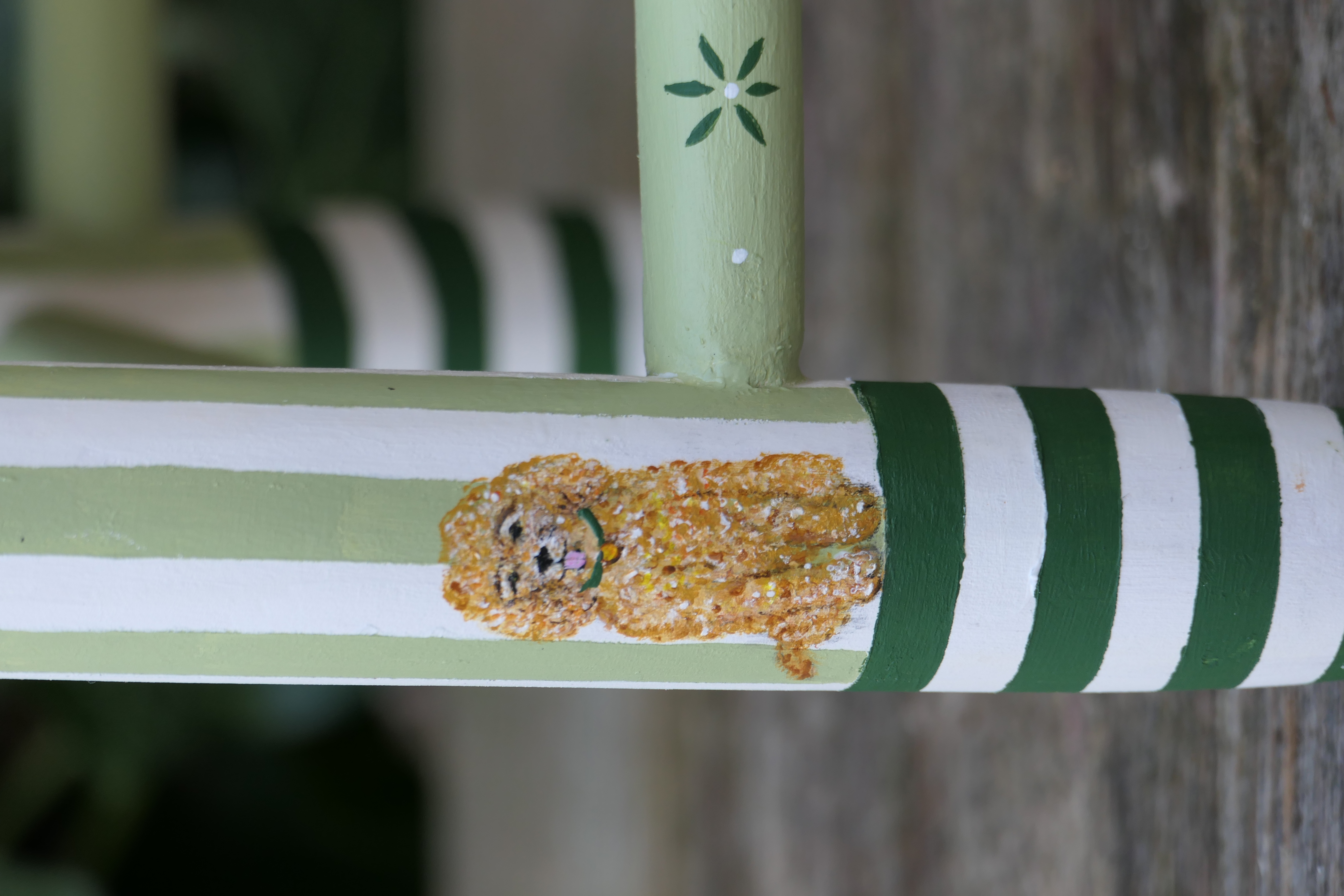 Petite chaise ancienne dénichée d’occasion et personnalisée sur mesure pour le petit Charly, arrivé dans une famille passionnée de nature et de chasse, déjà accompagnée d’un adorable poodle.