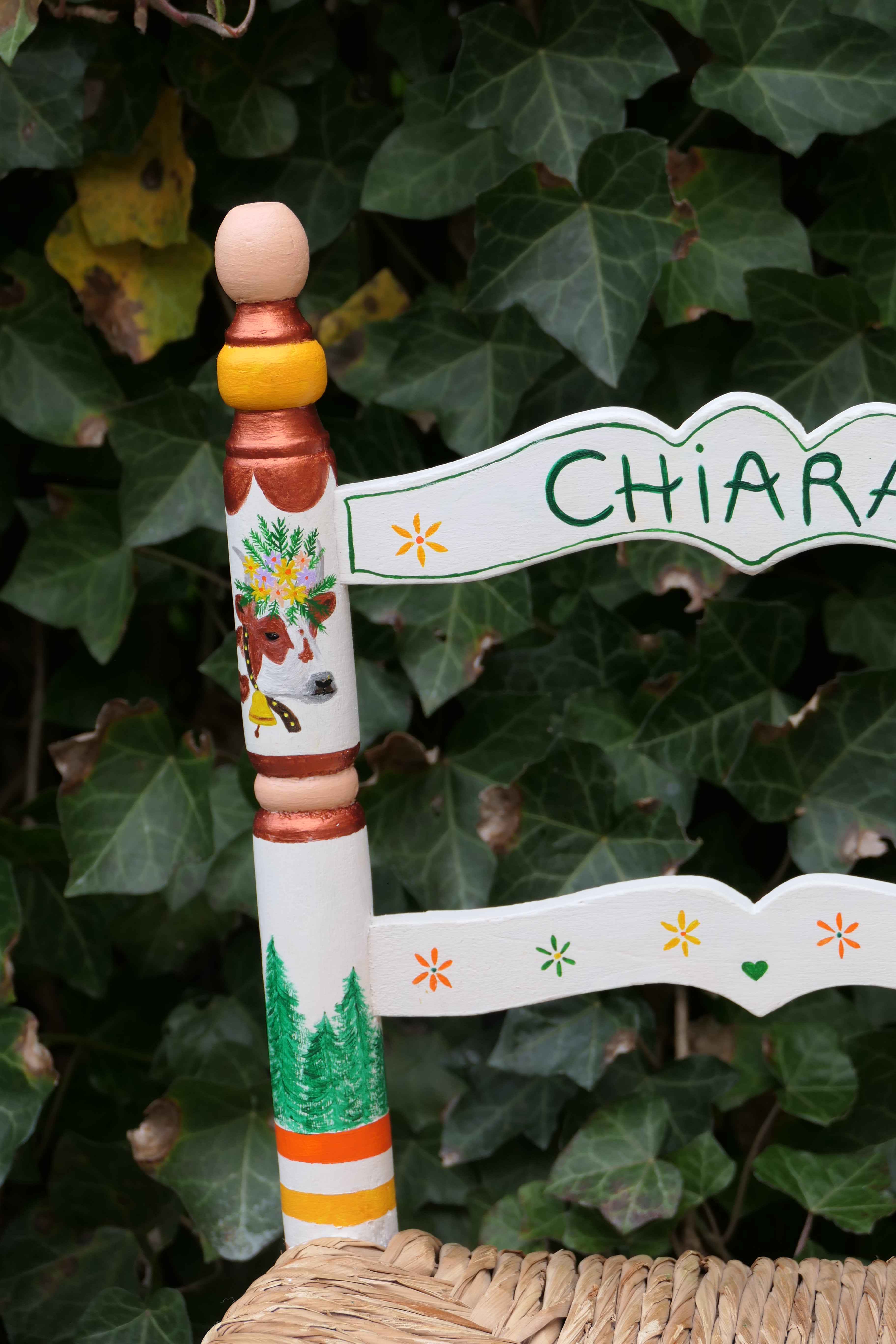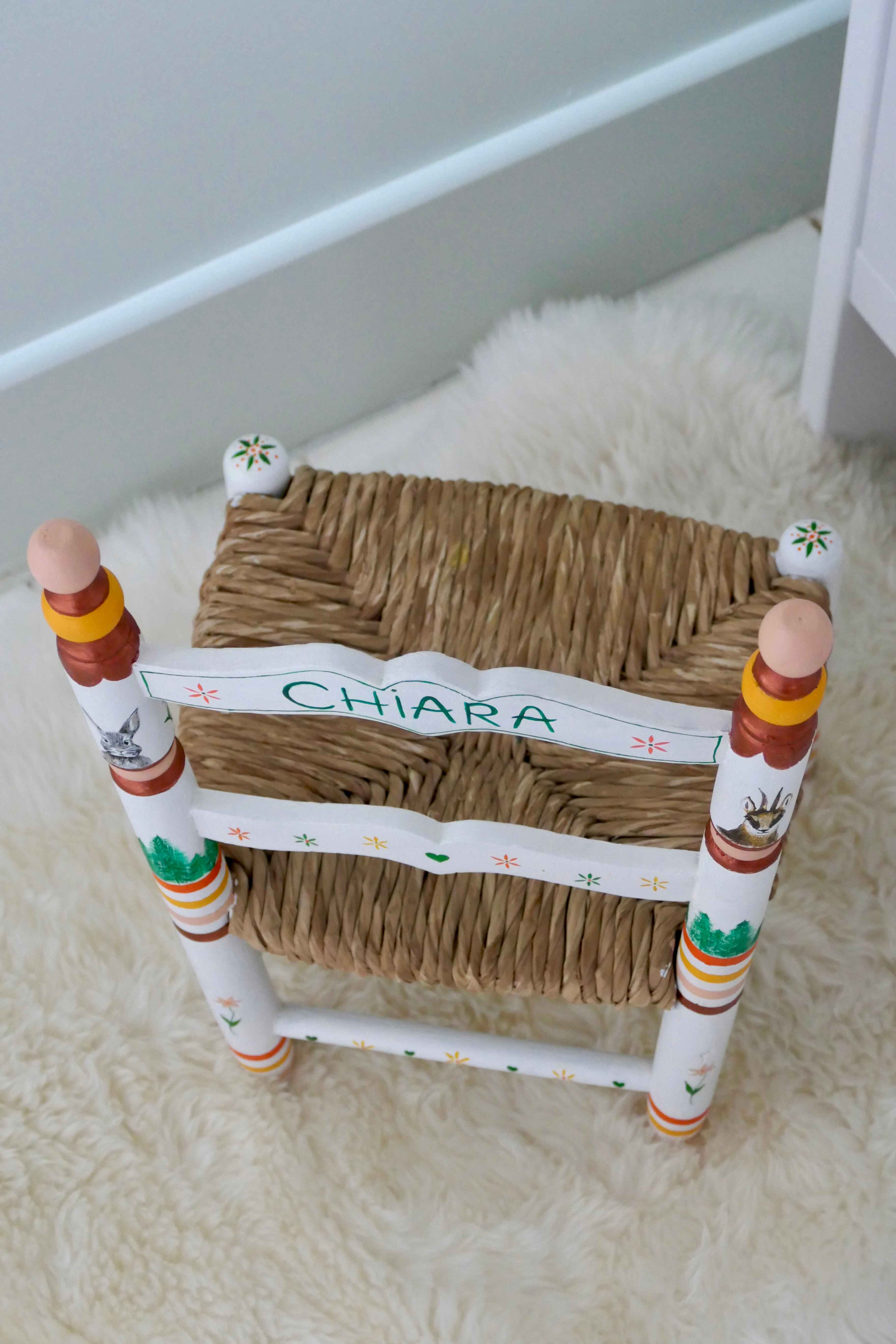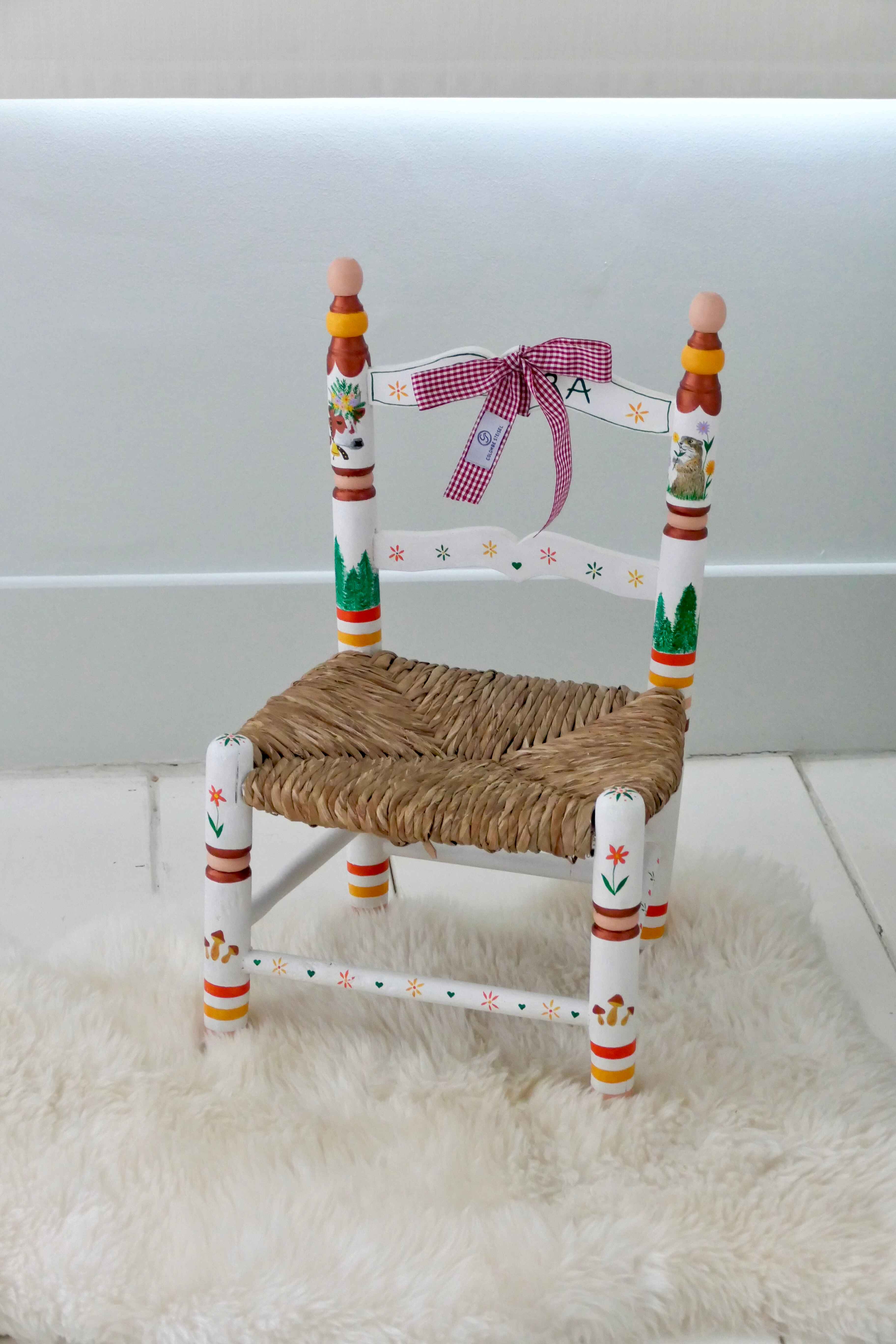 Petite chaise vintage décorée sur mesure pour une petite Suissesse, inspirée par le charme enchanteur des montagnes suisses.