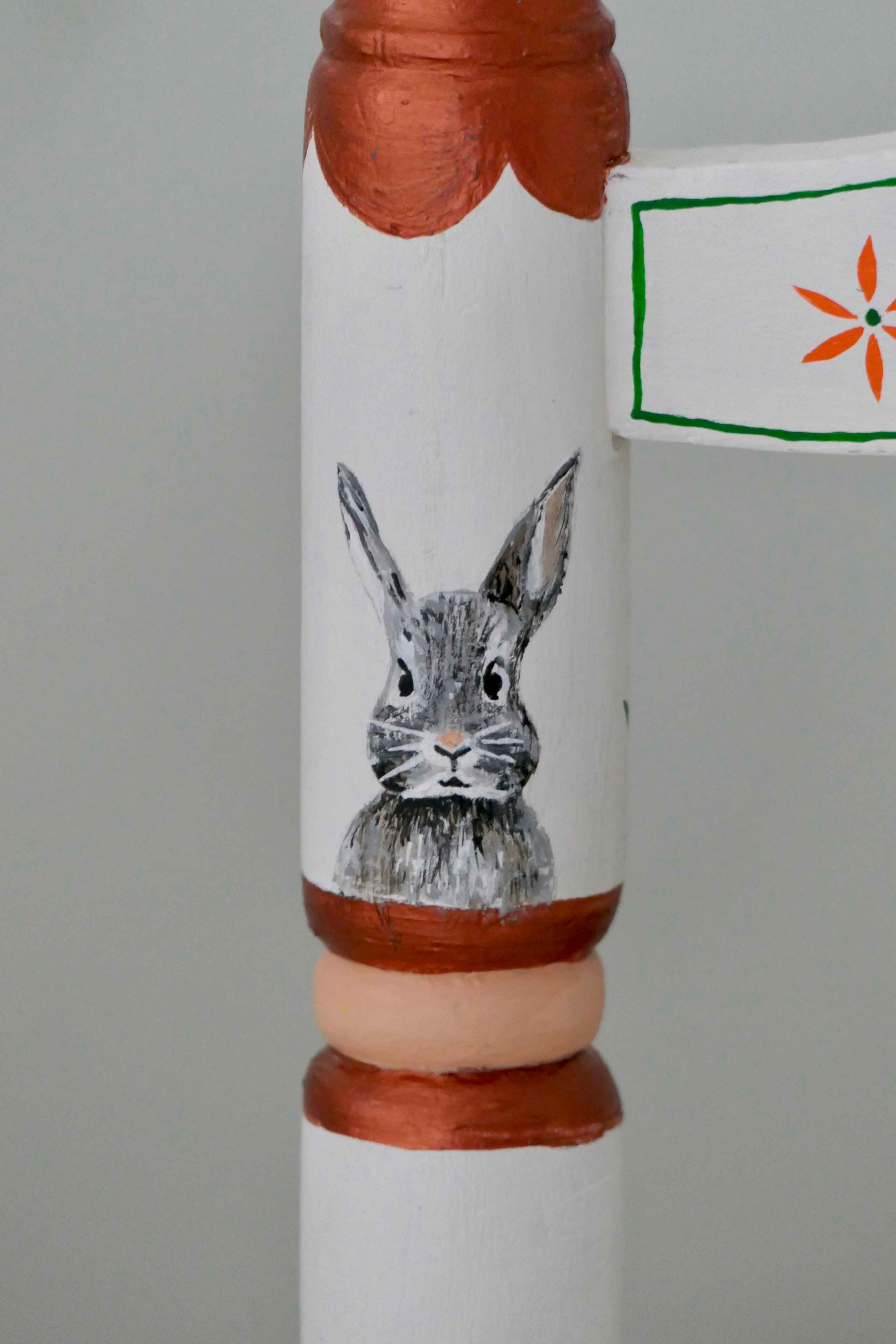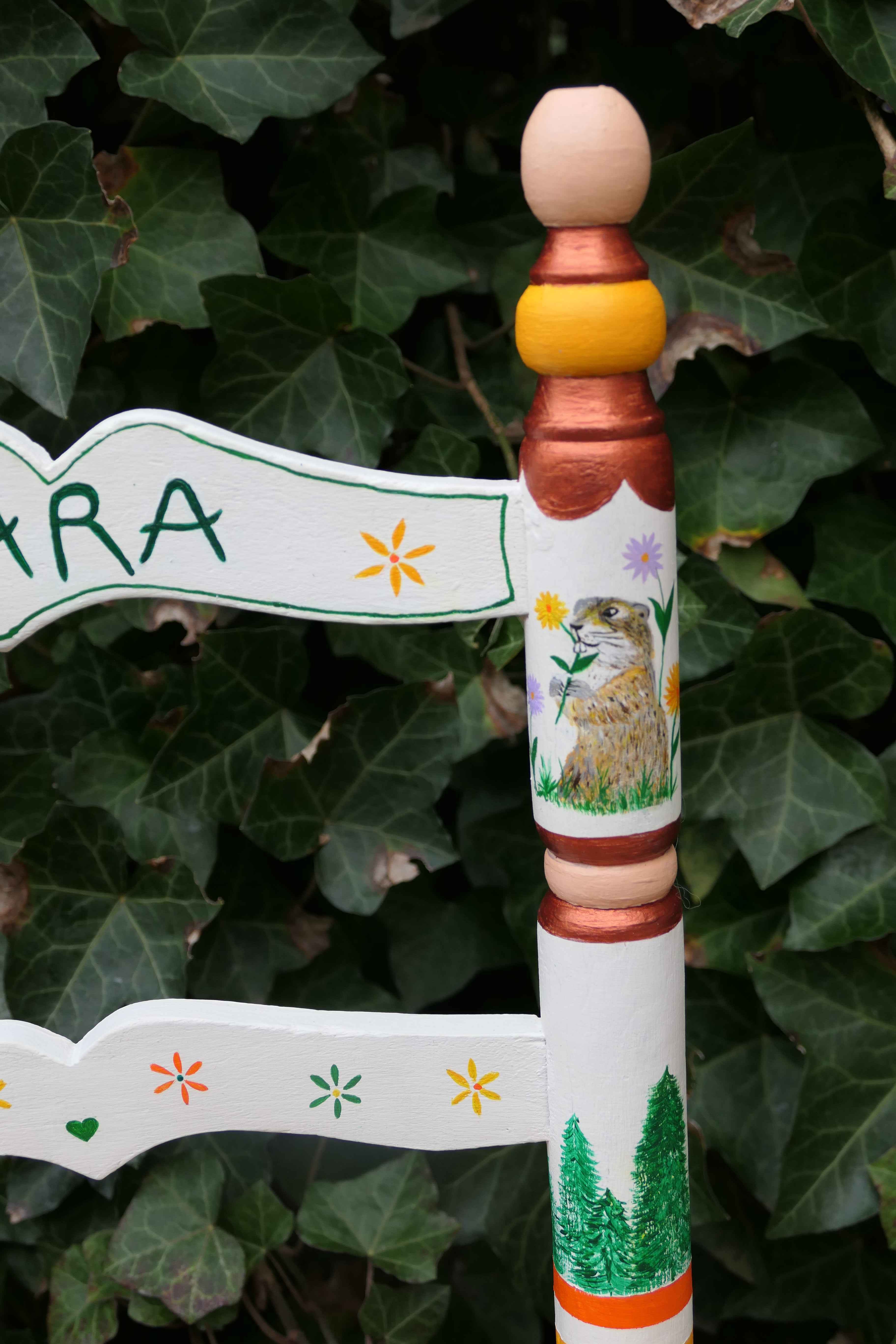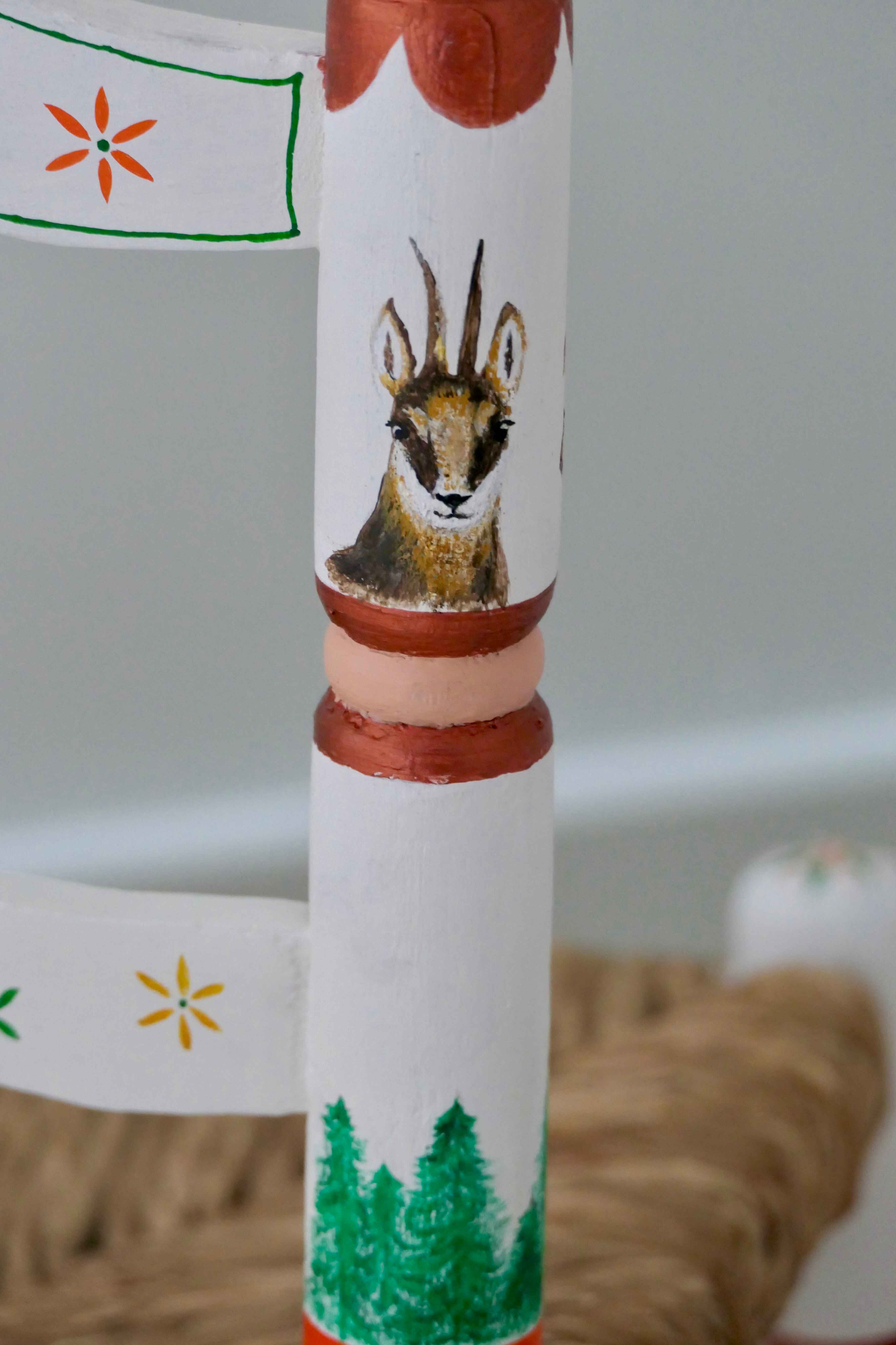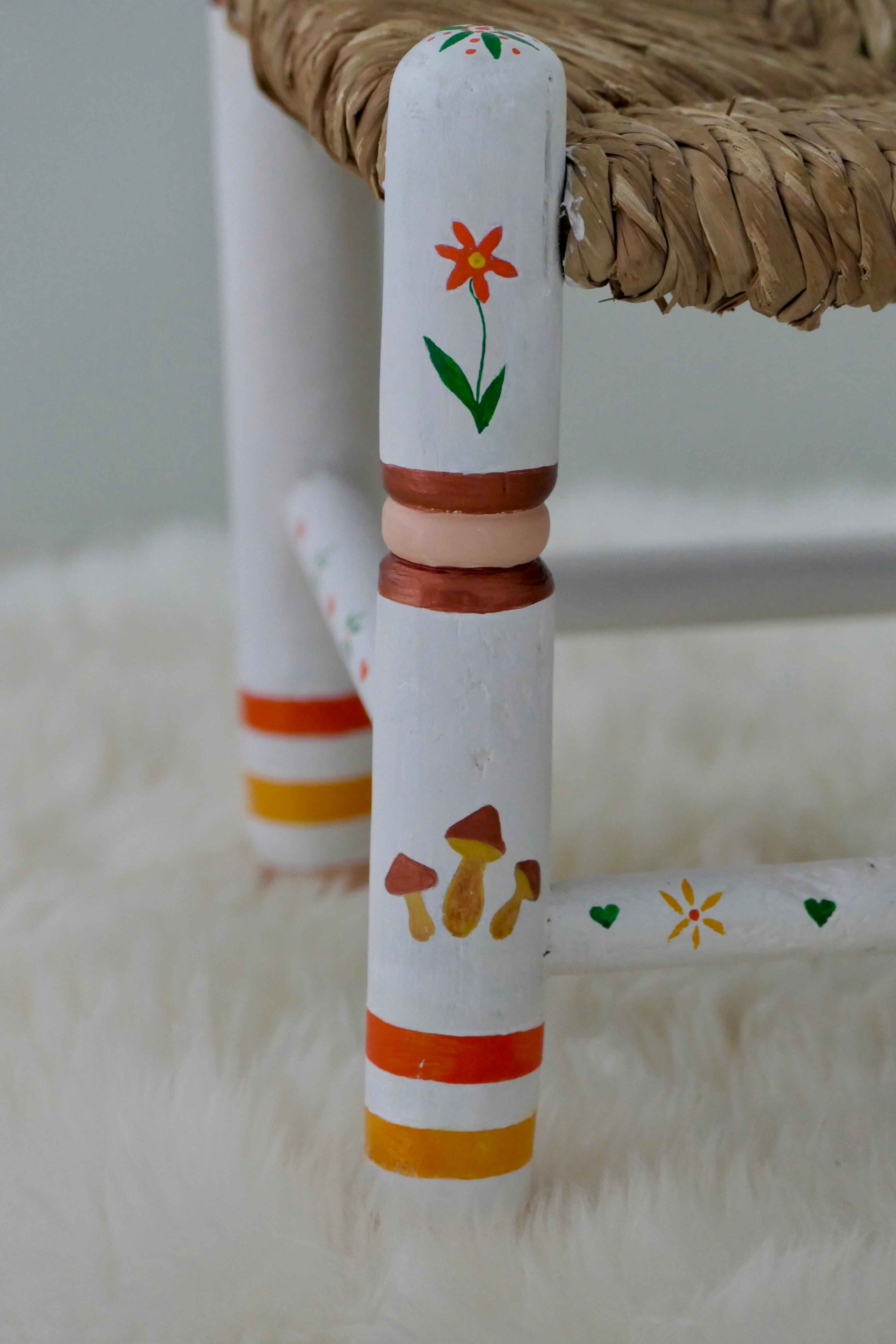Petite chaise vintage décorée sur mesure pour une petite Suissesse, inspirée par le charme enchanteur des montagnes suisses.