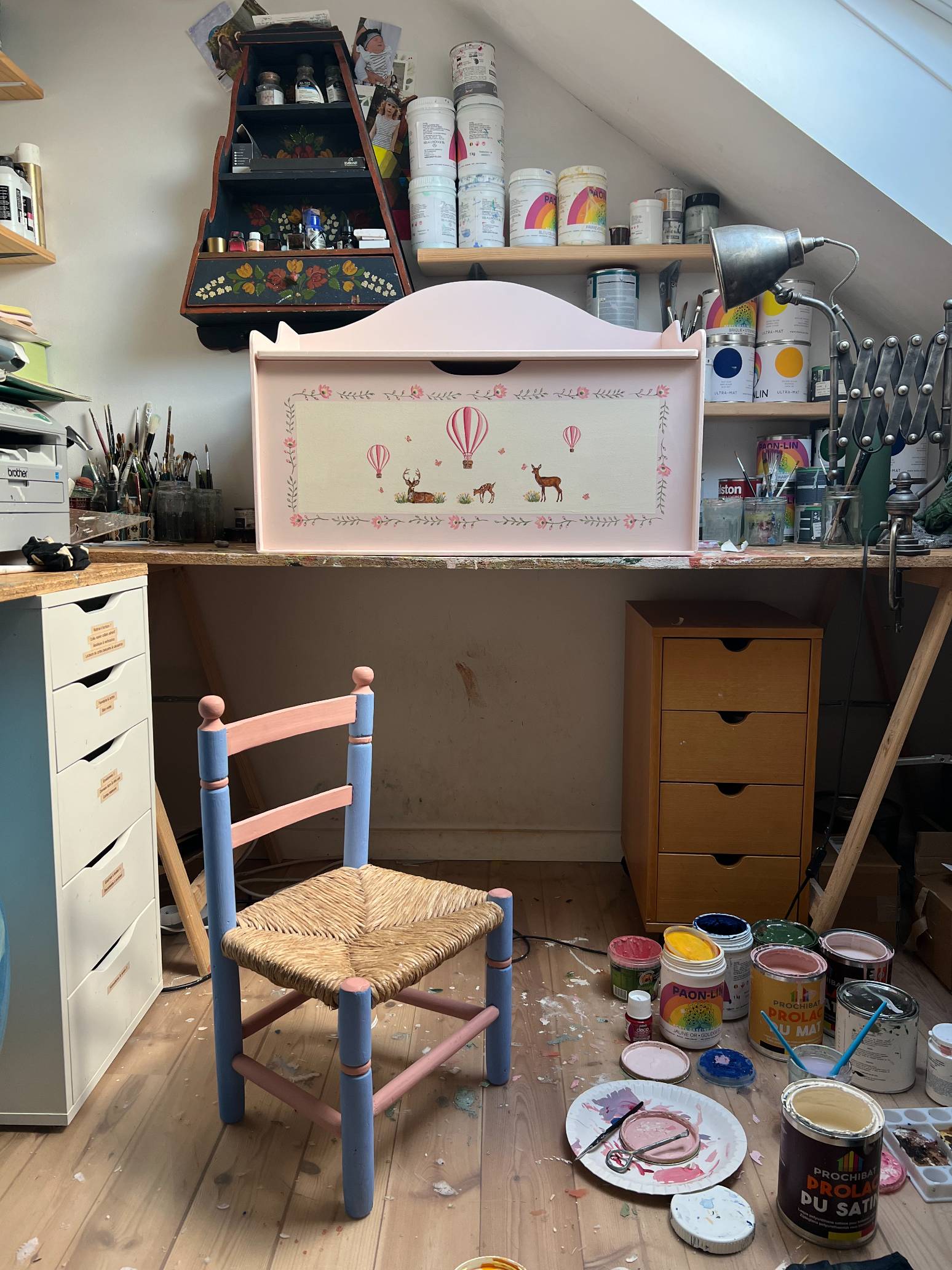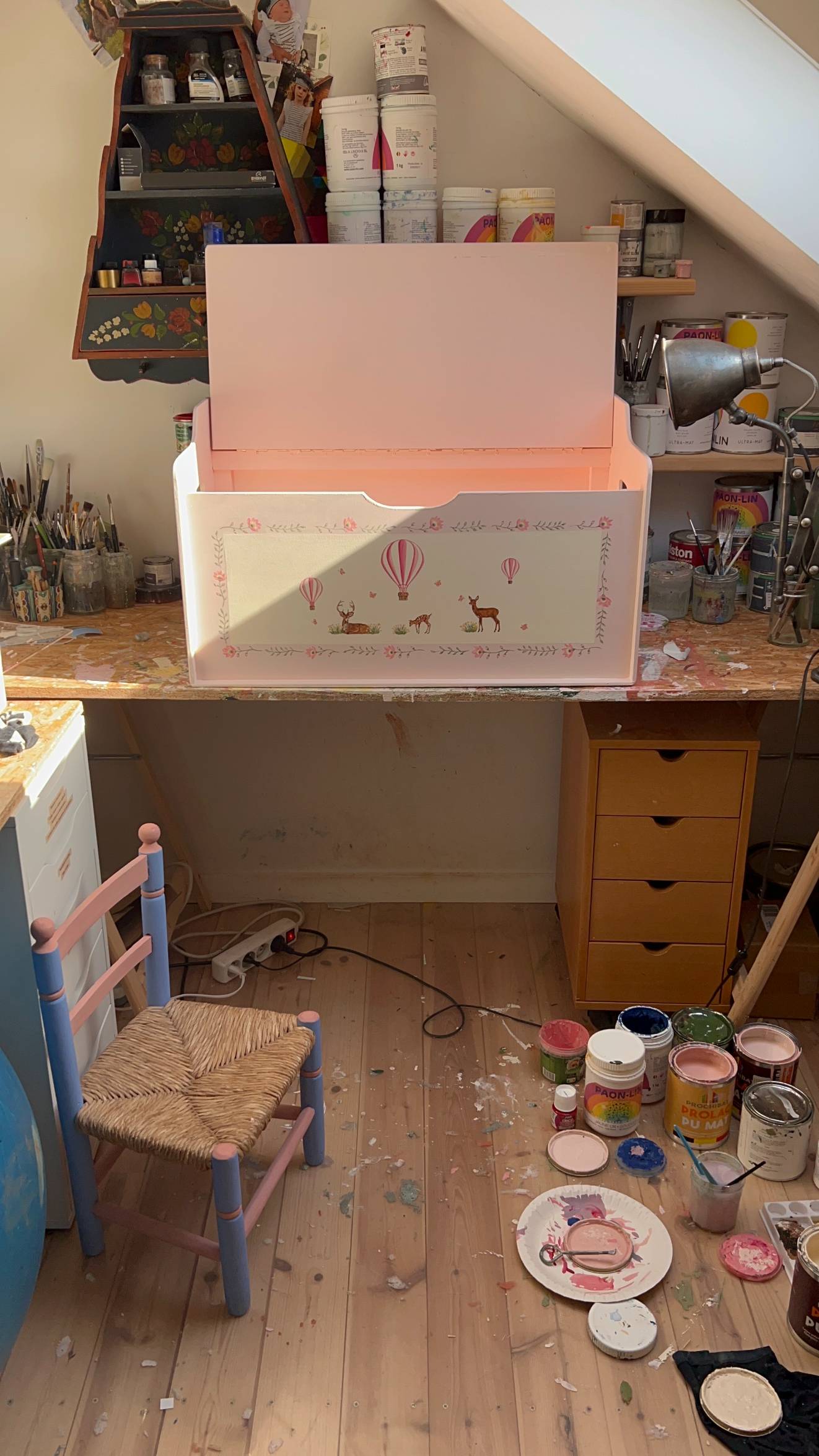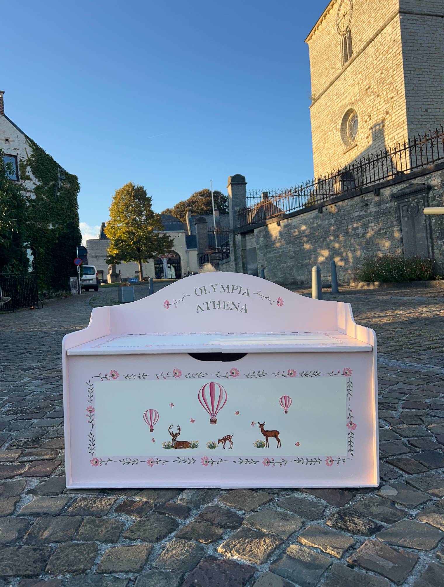 Coffre à jouets réalisé pour deux sœurs, inspiré des décorations de leurs chambres et de leurs faire-part de naissance respectifs.
